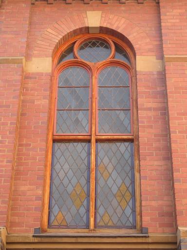Keywords: architecture building historic decorative window church red brick glass panes stained glass