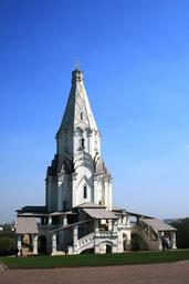 Keywords: architecture building historic church religion russian orthodox white arches pillars tent roof staircase blue sky green grass