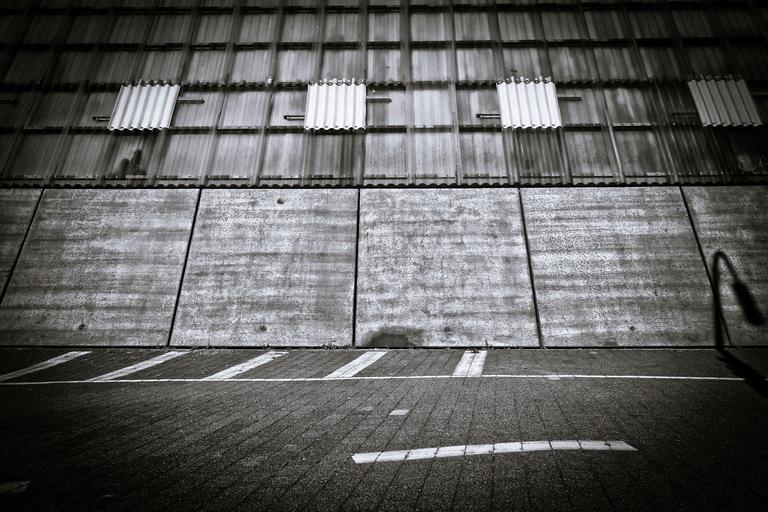 Keywords: architecture parking building dusk facade city modern big city düsseldorf geometric urban urban landscape construction shadow concrete artistically black white black and white gloomy mood