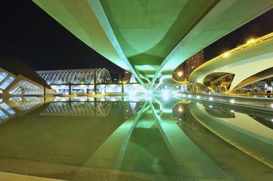 Keywords: architecture santiago calatrava reflection water pond city tourism spain valencia city of the arts valence building light night bridge modern bridge santiago