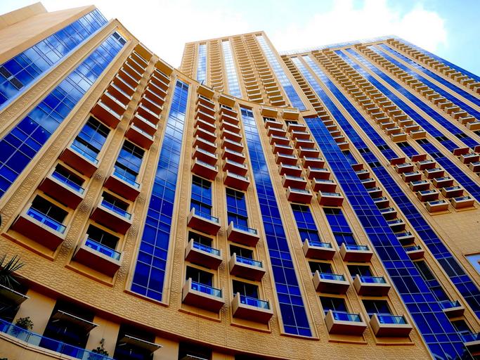 Keywords: architecture skyscraper facade city building skyline glass facades blue front window glass front dubai