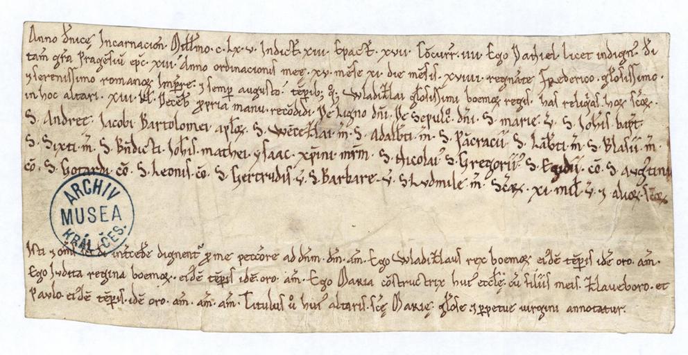 Keywords: Archiv Národního muzea - autentika pražského Daniela I., 1165.jpg cs Autentika pražského biskupa Daniela I pro kostel svatého Jakuba Staršího v Jakubu Dnes uložena Archiv Národního muzea fond Sbírka pergamenových listin A4 Vydána např v Codex diplomaticus regni Bohemiae I č 230http //147 231 53 91/src/index php s v cat 2 bookid 76 page 209 1165-11-19 http //www nm cz/Historicke-muzeum/Oddeleni-HM/Archiv-Narodniho-muzea/ anonymous biskup Daniel I písař other versions PD-Art Church of Saint James the Greater Jakub 1165 works National Museum Prague Vladislaus II of Bohemia Judith of Thuringia |
