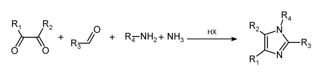 Keywords: Arduengo imidazoles.png Synthesis of substituted en imidazoles Reference US patent reference 6 177 575 2001 01 23 en Anthony J Arduengo III Process for Manufacture of Imidazoles en wikipedia 2006-12-26 Rifleman 82 wikipedia en chemical </nowiki> Debus-Radziszewski imidazole synthesis Carbonyl compounds Primary amines |