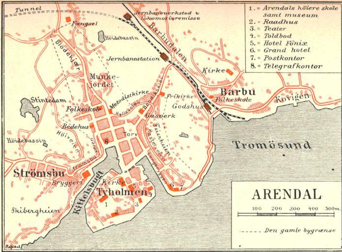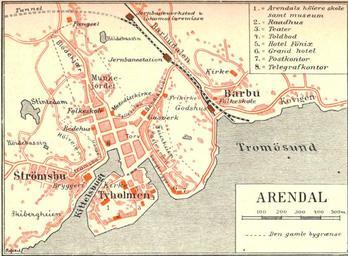 Keywords: Arendal-1907.png en 1907 map of Arendal Scanned from Illustreret Norsk Konversationsleksikon I Kristiania Aschehoug 1907 p 444 creator Ivar Refsdal 1907 Maps by Ivar Refsdal Old maps of Aust-Agder PD-old