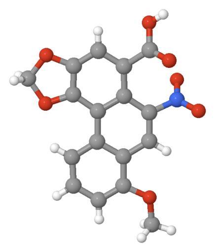 Keywords: Aristolochic-acid-from-xtal-2007-3D-balls-Jmol.png Ball-and-stick model of the aristolochic acid I molecule as found in the crystal structure Colour code Carbon C grey Hydrogen H white Nitrogen N blue Oxygen O red Structure by X-ray crystallography from http //dx doi org/10 1107/S1600536807058965 Acta Cryst 2007 E63 o4836 Model constructed in http //www crystalmaker com/ CrystalMaker 8 2 Image generated in http //jmol sourceforge net/ Jmol Own 2010-02-17 Ben Mills Benjah-bmm27 Images by Ben Mills Ball-and-stick models Aristolochic acid |