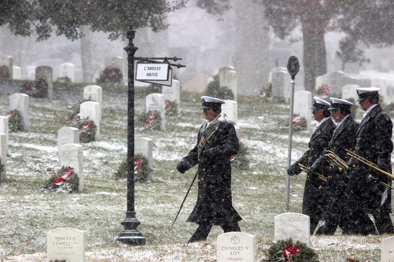 | Keywords: outdoor U.S. Navy Band drum major, Master Chief Musician Joe Brown leads the Ceremonial Band during a full honors funeral procession at Arlington National Cemetery during snowy conditions on Jan. 21, 2014. (U.S. Navy photo by Chief Musician Christian Johanson/Released) U.S. Navy Band drum major, Master Chief Musician Joe Brown leads the Ceremonial Band during a full honors funeral procession at Arlington National Cemetery during snowy conditions on Jan. 21, 2014. (U.S. Navy photo by Chief Musician Christian Johanson/Released) |