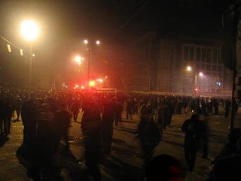 | Keywords: Armenian Presidential Elections 2008 Protest Day 11 - 1238AM Miasnikyan Square - general view south.jpg The 11th day of Armenian presidential election protests At 7 30 am the peaceful camp-in protest at Liberty Square in Yerevan was violently ended by Armenian special forces which used truncheons and electric shock devices to disperse the crowd of around 1 000 At 12 30 pm a new crowd marches to the French Embassy in a spontaneous demonstration barricade themselves using abandoned police buses and grow in number to around 150 000 By 12 am the bulk of the approximately 2 000 demonstrators left in the area are at Miasnikyan Square in front of the French Embassy while only tens of people are at the site of the looting of a grocery store near the intersection of Mashdots Ave and G Lusavorich Street a quarter mile northwest of the location of this camera The nearest police are stationed at Shahuman Square 1/3 of a kilometer northeast of the location of this camera Police allow looting to continue in the area of Mashdots Ave and G Lusavorich for several hours as government TV crews film tens of people looting the grocery store <br/><br/>In this picture 12 38 AM general view of Miasnikyan Square viewed south Own 2008-03-02 Serouj 40 10 29 99 N 44 30 20 42 E Demonstrations and protests relating to the Armenian presidential elections 2008 |
