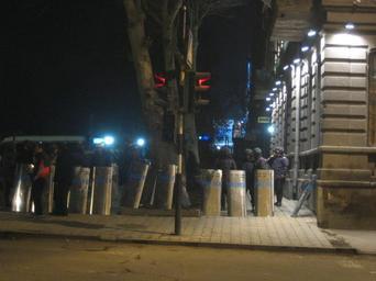 | Keywords: Armenian Presidential Elections 2008 Protest Day 11 - 1251AM Shahumyan Square - riot police closeup.jpg The 11th day of Armenian presidential election protests At 7 30 am the peaceful camp-in protest at Liberty Square in Yerevan was violently ended by Armenian special forces which used truncheons and electric shock devices to disperse the crowd of around 1 000 At 12 30 pm a new crowd marches to the French Embassy in a spontaneous demonstration barricade themselves using abandoned police buses and grow in number to around 150 000 By 12 am the bulk of the approximately 2 000 demonstrators left in the area are at Miasnikyan Square in front of the French Embassy while only tens of people are at the site of the looting of a grocery store near the intersection of Mashdots Ave and G Lusavorich Street a quarter mile northwest of the location of this camera <br/><br/>This picture 12 51 AM shows the nearest police which are stationed at Shahuman Square Police allow looting to continue in the area of Mashdots Ave and G Lusavorich for several hours as government TV crews film tens of people looting the grocery store The opposition has alleged that the tens of looters were led by government provocateurs in order to display violence on the streets which would be used to justify the state of emergency Own 2008-03-02 Serouj 40 10 31 80 N 44 30 32 74 E Demonstrations and protests relating to the Armenian presidential elections 2008 |