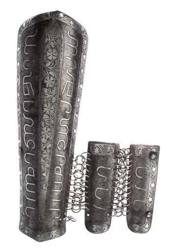 | Keywords: Armskena, 1500-talets slut - Livrustkammaren - 100654.tif LSH artwork sv Armskena sammansatt av en större skena för armens utsida och två mindre för insidan förenade med tre rader onitade stålringar d 14 mm i varje rad 11 - 12 ringar Fästnring runt armen urspr med två remmar tre fästnitar och ett nithål kvar Skenorna välvda den större med en liten spets upptill och nertill största b 100 mm b nertill 68 mm De mindre skenorna med rak överkant och rundad nederkant l 130 mm b upptill 45 mm den yttre skenan l 127 b upptill 45 mm <br/>Dekor i påslaget silver i form av bladrankor med öppna blad och inströdda fembladiga blommor som kantbård på alla skenorna Bården upphör vid fästringarna På den större skenan mittfält spetsigt i båda ändar med bladranka med inströdda sexbladiga flikiga blommor På den större skenan dessutom två textrader med med arabisk text på de mindre vardera tre skrifttecken original caption Armskena 1500-talets slut <br/> Nyckelord Armskenor Föremålsbild end other date century 16 g 460 size mm 322 LRK Alexander Keller Theodor Keller Alexej Ivanovitj Schachovskoj furste Krigsbyte 2007-2008 The Ottoman Orient in Renaissance Art 2015 Centre for Fine Arts/BOZAR Bryssel och Muzeum Narodowe W Krakowie Krakow place of origin original filename lm_dig15748 45771 inventory number LRK 9674 100654 CC-BY-SA Miguel Herranz <gallery caption Different images of same object > File Armskena 1500-talets slut - Livrustkammaren - 100653 tif File Ryttarhjälm Ryttarhjälm samt armskenor - Livrustkammaren - 7961 tif </gallery> <gallery caption Related objects > File Hjälm från sidan - Livrustkammaren - 17124 tif LRK 9671 File Ryttarhjälm polsk typ - Livrustkammaren - 51427 tif LRK 9671 File Hjälm uppifrån 1500-talets slut - Livrustkammaren - 100659 tif LRK 9672 File Pannskydd och delar av nackskydd till ryttarhjälm nnr 9671 polsk typ 1500-tal - Livrustkammaren - 52594 tif LRK 9673 File Hjälm bakifrån 1500-talets slut - Livrustkammaren - 100655 tif LRK 9671 File Ryttarhjälm polsk typ - Livrustkammaren - 68550 tif LRK 9671 File Hjälm uppifrån - Livrustkammaren - 42806 tif LRK 9671 File Ryttarhjälm polsk typ - Livrustkammaren - 77354 tif LRK 9671 File Hjälm 1500-talets slut - Livrustkammaren - 100658 tif LRK 9672 File Pannskydd och delar av nackskydd till ryttarhjälm nnr 9671 polsk typ 1500-tal - Livrustkammaren - 61155 tif LRK 9673 File Hjälm 1500-talets slut - Livrustkammaren - 100657 tif LRK 9672 File Hjälm 1500-talets slut - Livrustkammaren - 100656 tif LRK 9672 File Ryttarhjälm polsk typ - Livrustkammaren - 59988 tif LRK 9671 </gallery> Vambrace images from Livrustkammaren Miguel Herranz Media contributed by LSH 2015-11 Color images from Livrustkammaren |