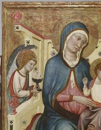 | Keywords: Arnau Bassa - Triptych with Madonna and Child with the Crucifixion and the Annunciation - Walters 37468 - A T Detail A.jpg Circle of The central scene of this altarpiece depicts the enthroned Madonna and Child flanked by angels The Christ Child holds a tiny European goldfinch a symbol of his resurrection The bird is tethered a reminder that in the 14th century such animals were kept as pets by children Angels present Mary with chalices of white flowers alluding to her purity On the left appear the Annunciation and the Crucifixion while Christ's Presentation in the Temple and the Coronation of the Virgin are on the right The delicate punch-work decoration and the slender graceful figures reveal the influence of Sienese painting Catalan artists learned the style and techniques of Italian painting by examining imported Italian works in local churches; some even traveled to Italy to perfect their craft ca 1340 1348 Medieval tempera and gold leaf on panel cm 126 8 184 9 accession number 37 468 1582 Henry Walters Baltimore 1931 mode of acquisition unknown Walters Art Museum Henry Walters Acquired by Henry Walters 1931 The International Style The Arts in Europe Around 1400 The Walters Art Gallery Baltimore 1962 place of origin Catalonia Spain Walters Art Museum license 2D Triptych with Madonna and Child with the Crucifixion and the Annunciation Media contributed by the Walters Art Museum needs category review |