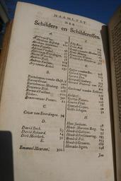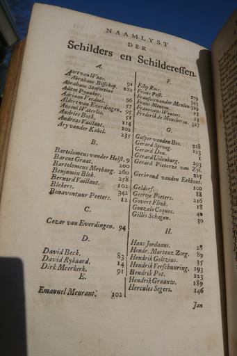 Keywords: Arnold Houbraken VII Naamlyst 1.JPG en Copy of Arnold Houbraken's Schouburg from 1719 published and sold by the author nl Naamlyst der Schilders en Schilderessen Bisschop Abraham de jongste 222 Pardanus A 145 Staphortius Abraham 344 Dyk Abraham van 345 Meulen Antoine Francois vander 329 Pynaker Adam 96 Kabel Ary van der 235 Verdoel Adriaan 57 Waas Aart van 91 ADriaansen Alexander 144 Couper Joan 87 Withoos Alida 188 Everdingen Aldert van 95 Vaillant Andreas 102 Both Andries 114 Fischer Anna Katrina 259 Goebouw Antonius 142 Waterloo Antoni 51 Wolfart Artus 145 Graat Barent 200 Bisbink Barent 345 Meyburg Bartholomeus 260 Helst Bartolomeus vander 9 Blok Benjamin 258 Vaillant Bernard 102 Peeters Bonaventuur 12 Everdingen Cesar van 94 Savoyen Karel van 53 Oostries Josef 209 Rozee Juffrouw 262 Biset Karel Emanuel 292 Siriep Kristiaan 345 Pierson Kristoffel 260 Hek Nicolaas vander 7 Meulen Klaas vander 209 Bisschop Kornelis of Biskop 220 Brizé Kornelis 341 Wieringen Kornelis 123 Man Kornelis de 99 Keulen Janson van 224 Kik Kornelis 333 Slingelant Kornelis van 345 Visscher Kornelis de 92 Beck David 83 Rykaert David 14 Blekers 342 Helmbrker Theodoor 108 Meerkerk Dirk 91 Murant Emanuel 102 Neve Franciscus de 142 Menton Frans 15 Post Frans 343 Withoos Frans 189 Wouters Franciscus 13 Eykens Francois 144 Moucheron Frederik de 327 Hoochstadt Gerrit van 144 Eyck Gaspar van 142 Pieters Geertje 216 Gelsdorf 88 Zyl Gerard Pieterze van 225 Eekhout Gerbrant vanden 100 Dou Gerrit 1 Uilenburg Gerard 293 Schagen Gillis 30 Coques Gonzalo 40 Flink Govert 18 Tys Gysbrecht 144 Jordaans Hans 28 Streek Hendrik van 292 Pot Hendrik 123 Goltzius Hend 35 Graauw Hendrik 189 Heerschap 145 Martensz Hendrik bygenaamt Zorgh 89 Verschuring Hendrik 193 Segers Hercules 136 2015-04-23 18 16 38 own PD-old-100 Jane023 other versions cc-0 Schouburg II Uploaded with UploadWizard