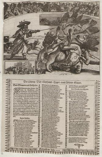| Keywords: Arolsen Klebeband 18 063.jpg Grafik aus dem Klebeband Nr 18 der Fürstlich Waldeckschen Hofbibliothek Arolsen Motiv Einblattdruck zum Zweiten Nordischen Krieg links klein Seeschlacht von Kopenhagen 1658 Der Löwen-Bär-Elephant-Tyger-und Adlers-Streit http //digi ub uni-heidelberg de/fwhb/klebeband18 1659 author Public Domain due to age The scan is also licensed CC-BY-SA 3 0 DE PD-old-100 Arolsen Klebeband 18 Single sheet prints 1659 engravings Fighting animals in art Animal fights blood sport Polish “Swedish War 1655 “1660 |