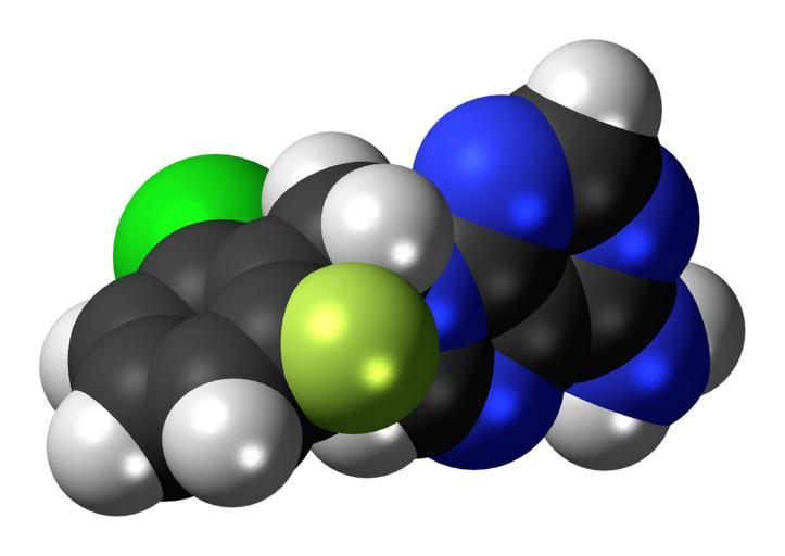 Keywords: Arprinocid molecule spacefill.png Space-filling model of the arprinocid molecule an antiparasitic agent Color code 505050 Carbon C black<br> F0F0F0 Hydrogen H white<br> 3C50FA Nitrogen N blue<br> C8FA64 Fluorine F yellow-green<br> 14F014 Chlorine Cl green<br> 2011-08-02 own DS Visualizer Jynto talk Ball-and-stick version cc-zero Images by Jynto Space-filling models Antiparasitic agents Purines Chlorofluorobenzenes |