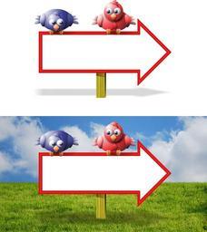 Keywords: arrow birds blank clouds direction grass hanging sign indicate isolated lawn one way outdoors outside park perched point post shadow sign sky summer that way tweet white