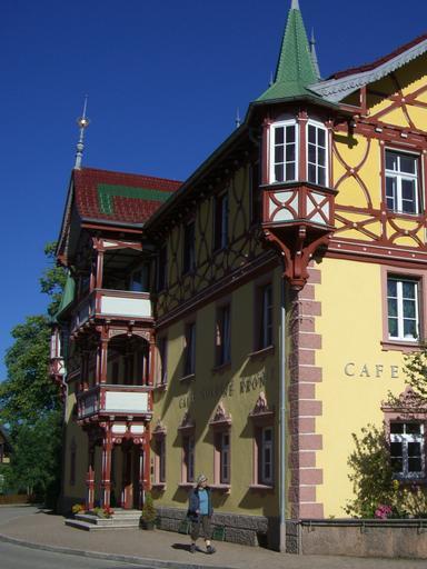 Keywords: art nouveau building architecture historical facade bay window turret window cafe golden crown st mar gene women economic hochschwarzwald sky blue