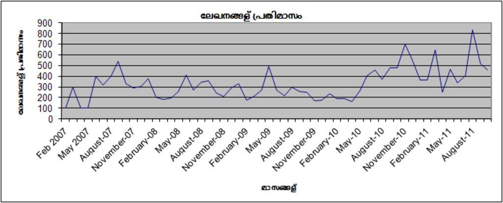 Keywords: ArticlesPerMonth-31Oct11.PNG en ml wiki new pages per month own Jacob jose 2011-11-10 Cc-zero Malayalam Wikipedia articles per month