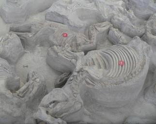 | Keywords: Ashfall Fossil Beds - Teleoceras and Cormohipparion.jpg en Ashfall Fossil Beds in Antelope County Nebraska According to nearby signs the 1 marker is on a young adult Teleoceras major nicknamed Tusker ; its estimated age is 8-9 years with wisdom teeth beginning to come in; the femur across its face near the bottom of the photo was probably taken from a neighboring carcass by a large predator The 2 marker is on the remains of a three-toed horse Cormohipparion occidentale 2012-09-09 14 26 00 own Ammodramus cc-zero Pictures by Ammodramus Taken with Panasonic Lumix DMC-FZ20 Ashfall Fossil Beds Uploaded with UploadWizard Teleoceras Equidae fossils |