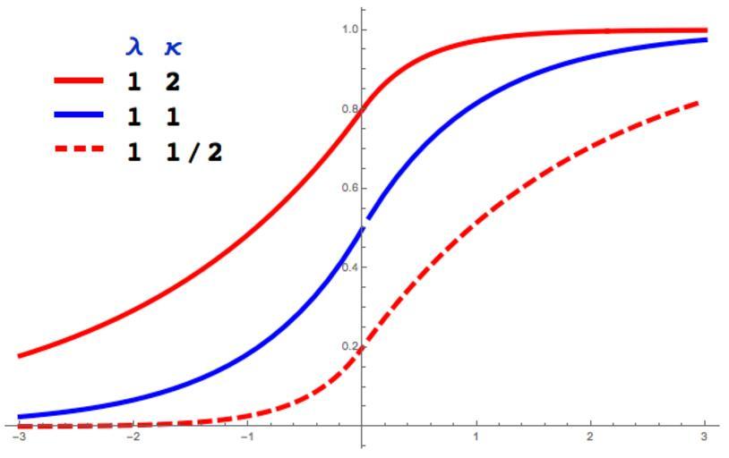 | Keywords: AsymmetricLaplaceCDF.jpg en Some examples of the cumulative distribution function for the asymmetric Laplace distribution with mean zero and scaling parameter λ 1 Blue corresponds to asymmetry parameter κ 1 the solid red κ 2 and the dashed red κ 1/2 own PAR 2016-01-04 Statistical charts Cc-zero |