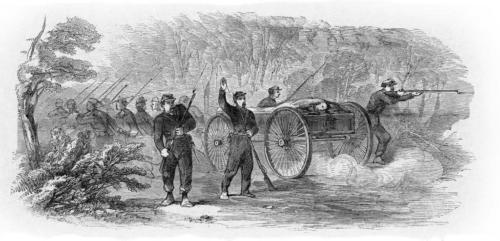 Keywords: blackandwhite monochrome black and white The Duryea Zouaves Carrying off the Body of Lieu. Greble from the Field of Battle, Amidst the Fire of the Secession Forces, at Great Bethel. - Sketched by Our Special Artist (Published in Frank Leslie's Illustrated Newspaper, June 29, 1861.) The Battle of Big Bethel was one of the earliest land battles of the American Civil War. It took place on the Virginia Peninsula, near Newport News, on June 10, 1861. The Virginia State government had refused President Abraham Lincoln’s appeal for troops to put down the rebellion of the southern states, and its decision to secede from the Union was ratified by popular vote on May 23, 1861. Confederate Colonel (later Major General) John B. Magruder was sent down the peninsula to deter any advance on the state capital Richmond by Union troops based at the well-defended post of Fort Monroe. This garrison was commanded by Major General Benjamin Butler, a former Massachusetts lawyer and politician, who established a new camp at nearby Hampton and another at Newport News. Magruder had also established two camps, within range of the Union lines, at Big Bethel and Little Bethel, as a lure to draw his opponent into a premature action. Butler took the bait, when he and an aide, Major Theodore Winthrop, devised a plan for a dawn attack on June 10, 1861, after a night march to drive the Confederates back from their bases. Butler chose not to lead the force in person, for which he was later criticized. The plan proved too complex for his poorly-trained subordinates to carry out, especially at night, and his staff had also omitted to communicate the passwords. They were trying to advance without knowledge of the layout or strength of the Confederate positions, when a friendly fire incident gave away their own. The commander in the field, Massachusetts militia general Ebenezer Peirce, received the most criticism for the failed operation. The Union forces suffered 76 casualties, with 18 killed, including Major Winthrop and Lieutenant John T. Greble, the first regular army officer killed in the war. The Confederates suffered only 8 casualties, with 1 killed. Although Magruder subsequently withdrew to Yorktown and his defensive line along the Warwick River, he had won a propaganda victory and local Union forces attempted no further significant advance until the Peninsula Campaign of 1862. While small in comparison to many later battles, Big Bethel attracted considerable press coverage and exaggerated importance because of the newness of the war and the general feeling the war would be short. The engagement was also known as the Battle of Bethel Church or Great Bethel. Read more at en.wikipedia.org/wiki/Battle_of_Big_Bethel The Duryea Zouaves Carrying off the Body of Lieu. Greble from the Field of Battle, Amidst the Fire of the Secession Forces, at Great Bethel. - Sketched by Our Special Artist (Published in Frank Leslie's Illustrated Newspaper, June 29, 1861.) The Battle of Big Bethel was one of the earliest land battles of the American Civil War. It took place on the Virginia Peninsula, near Newport News, on June 10, 1861. The Virginia State government had refused President Abraham Lincoln’s appeal for troops to put down the rebellion of the southern states, and its decision to secede from the Union was ratified by popular vote on May 23, 1861. Confederate Colonel (later Major General) John B. Magruder was sent down the peninsula to deter any advance on the state capital Richmond by Union troops based at the well-defended post of Fort Monroe. This garrison was commanded by Major General Benjamin Butler, a former Massachusetts lawyer and politician, who established a new camp at nearby Hampton and another at Newport News. Magruder had also established two camps, within range of the Union lines, at Big Bethel and Little Bethel, as a lure to draw his opponent into a premature action. Butler took the bait, when he and an aide, Major Theodore Winthrop, devised a plan for a dawn attack on June 10, 1861, after a night march to drive the Confederates back from their bases. Butler chose not to lead the force in person, for which he was later criticized. The plan proved too complex for his poorly-trained subordinates to carry out, especially at night, and his staff had also omitted to communicate the passwords. They were trying to advance without knowledge of the layout or strength of the Confederate positions, when a friendly fire incident gave away their own. The commander in the field, Massachusetts militia general Ebenezer Peirce, received the most criticism for the failed operation. The Union forces suffered 76 casualties, with 18 killed, including Major Winthrop and Lieutenant John T. Greble, the first regular army officer killed in the war. The Confederates suffered only 8 casualties, with 1 killed. Although Magruder subsequently withdrew to Yorktown and his defensive line along the Warwick River, he had won a propaganda victory and local Union forces attempted no further significant advance until the Peninsula Campaign of 1862. While small in comparison to many later battles, Big Bethel attracted considerable press coverage and exaggerated importance because of the newness of the war and the general feeling the war would be short. The engagement was also known as the Battle of Bethel Church or Great Bethel. Read more at en.wikipedia.org/wiki/Battle_of_Big_Bethel |