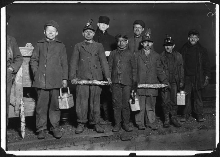 | Keywords: At the close of day. Just up from the shaft - NARA - 523373.jpg Scope and content At the close of day Just up from the shaft All work below ground in Shaft 6 Pennsylvania Coal Co Clement Tiskie smallest boy next to right hand end is a nipper Arthur Havard on Clement's right hand is a driver Jo Puma on Arthur's right is a nipper Jo's mother showed me the passport which shows Jo to be 14 years old but he has no school certificate although working inside the mine Frank Fleming boy on left of photo a nipper Works a mile underground from the shaft which is 500 ft down South Pittston Pa General notes 523373 Local identifier 102-LH-1915 Department of Commerce and Labor Children's Bureau 1912 - 1913 NARA-Author Hine Lewis Wickes 1874-1940 Photographer 1122914 <br /> Still Picture Records Section Special Media Archives Services Division NWCS-S National Archives at College Park 8601 Adelphi Road College Park MD 20740-6001 1911-01-06 Record group Record Group 102 Records of the Children's Bureau 1908 - 2003 Record group ARC 431 National Child Labor Committee Photographs taken by Lewis Hine compiled ca 1912 - ca 1912 documenting the period 1908 - 1912 Series ARC 523064 File unit File unit ARC Variant control numbers NAIL Control Number NWDNS-102-LH-1915 Other versions <gallery> File At_the_close_of_day _Just_up_from_the_shaft_-_NARA_-_523373 tif tif File At_the_close_of_day _Just_up_from_the_shaft_-_NARA_-_523373 jpg jpg </gallery> NARA-cooperation PD-USGov Child labor in the United States |