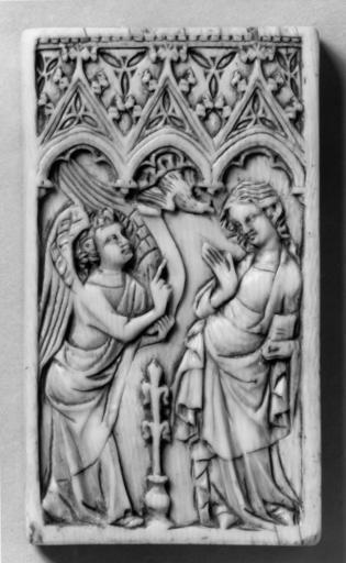| Keywords: Atelier of the Boxes - Box Bottom with the Annunciation - Walters 711156.jpg Gabriel approaches from the left pointing his finger towards a scroll The Virgin who raises her right hand in surprise holds a book in her left Her apron-style drapery has cascades of small folds falling at either side A vase with a lily sits between the figures and the Holy Ghost descends from the clouds above The scene is set beneath a canopy of three trefoil arches surmounted by a band of dentils The Annunciation box appears to be the only religious ivory known from the Atelier of the Boxes The treatment of the architectural canopy is identical to other works from the workshop The interior which is the bottom of the box is divided into compartments to hold a balance and weights The sliding top of the box is missing 3rd quarter 14th century Medieval ivory cm 7 9 4 5 0 9 accession number 71 1156 22567 John Hunt Collection Dublin date and mode of acquisition unknown Lewis V Randall Montreal date and mode of acquisition unknown Ruth Blumka New York date and mode of acquisition unknown Walters Art Museum 1977 by purchase Museum purchase 1977 The Carver's Art Medieval Sculpture in Ivory Bone and Horn Jane Voorhees Zimmerli Art Museum New Brunswick 1989 place of origin north France Walters Art Museum license Medieval ivory in the Walters Art Museum Atelier of the Boxes Media contributed by the Walters Art Museum needs category review |