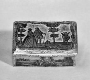 Keywords: Athanasius Stepanovich Popov - Snuffbox with Engraved Scenes - Walters 57720.jpg Rendered on the faces of the box are scenes of courting couples Niello an alloy of silver copper and lead was rubbed into the engraved scenes and then fired The darkened areas remained in the depressions when the piece was polished This technique dating from the Renaissance was revived in Russia during the 17th century 1769 silver niello cm 2 8 5 9 accession number 57 720 14841 Henry Walters Baltimore date and mode of acquisition unknown Walters Art Museum Henry Walters Acquired by Henry Walters Makers Mark place of origin Velikiy Ustyug Russia Walters Art Museum license Snuffboxs in the Walters Art Museum Athanasius Stepanovich Popov Niello Silver boxes 1769 in art |