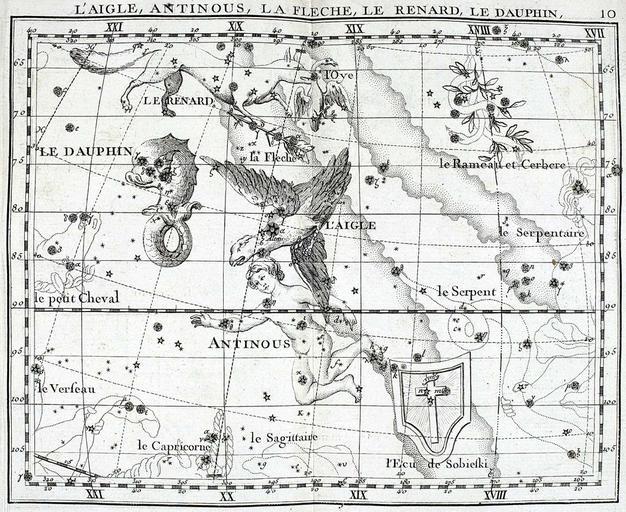 Keywords: Atlas Coelestis-10.jpg Atlas Coelestis http //www lindahall org/services/digital/ebooks/flamsteed1776/index shtml 1776 John Flamsteed PD-old-100 Atlas coelestis by John Flamsteed Aquila constellation Antinous constellation Sagitta Vulpecula Delphinus constellation Scutum |