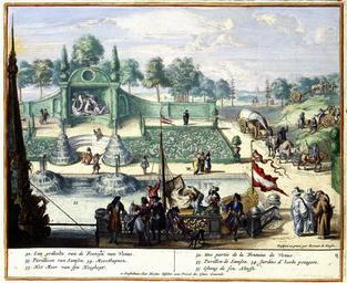 | Keywords: Atlas Van der Hagen-KW1049B11 075 16-Uitzicht op- Moestuinen.jpeg of the Atlas Van der Hagen in the catalogue of the KB http //opc4 kb nl/DB 1/TTL 1/LNG EN/PPN PPN 353012750 Creator Romeyn_de_Hooghe Author Designé et gravé par Romain de Hooghe Publisher Creator Nicolaes_Visscher_II Author Designé et gravé par Romain de Hooghe Publisher Creator Nicolaes_Visscher_II credit line ca 1685 Romeyn de Hooghe 1645-1708 graveerde omstreeks 1685 in opdracht van de uitgever Nicolaes Visscher II 1649-1702 een serie prenten van de beroemde tuin van Enghien even ten zuiden van Brussel De boomgaarden de moes- en de kruidentuinen vormden een integraal van het Parc dEnguien Hier zien we de moes- en de kruidentuinen Deze tuinen lagen afgeschermd door hoge groene hagen ter weerszijden van een van de toegangswegen naar het park ; Cijfers 34 36-37 worden verklaard in een legenda onder aan de kaart Rechtsonder R Samen op 1 blad met P The print shows the complex of pleasure gardens of Enghien near Brussels The plan is part of a series of prints commissioned by Nicolaes Visscher II 1649-1702 and engraved by Romeyn de Hooghe 1645-1708 The orchard vegetable and spice gardens form an integrated part of the Parc dEnguien These gardens separated by high green hedges were build on both sides of the entrance ways to the parc 23 x 28 cm exhibition history Institution Koninklijke Bibliotheek kopergravure Technique copper engraving KW1049B11_075_16 - Volume 1 Romeyn de Hooghe - Nicolaes Visscher II - Prinsen van Darenberg Information field Depicted locations Enghien - Brussels - Belgium object history object type Prent Print PD-old-100 place of creation place of discovery Source page at the http //resolver kb nl/resolve urn urn gvn KONB01 211 Geheugen van Nederland / Memory of the Netherlands website Koninklijke Bibliotheek Uitzicht op Moestuinen Uploaded with GWToolset Atlas Van der Hagen-KW1049B11_075_16-Uitzicht op Moestuinen http //resolver kb nl/resolve urn urn gvn KONB01 1049B11_075_16 size large Atlas van der Hagen Parc d ™Enghien in art |