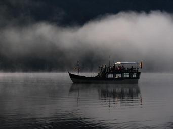 Keywords: atmosphere fog boot autumn autumn mood background nature october lake mirroring water
