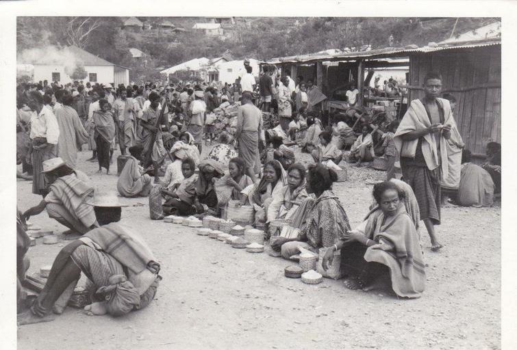 Keywords: Atsabe--o bazar 4.jpg pt O convívio no bazar onde se trocavam produtos e se mascava A masca era uma mistura de folha de bétel noz de areca e cal que produzia uma pasta avermelhada Na boca ficava entalada no lábio own Norberto Benigno 1968/1970 Foi publicado no Facebook Atsabe Vila Kemak Market people of East Timor Portuguese Timor |