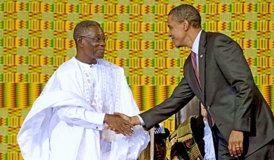 Keywords: AttaMills Obama 2012-08-01 B002.jpg The President of Ghana John Atta-Mills and the President of the United States of America Barack Obama in Accra Ghana at 1 August 2012 https //www facebook com/USEmbassyGhana/photos/a 241183319330758 53391 146328372149587/265600663555690/ type 3 src https 3A 2F 2Fscontent-fra3-1 xx fbcdn net 2Fhphotos-xpf1 2Fv 2Ft1 0-9 2F560863_265600663555690_629409351_n jpg 3Foh 3D3da3dd6a1a47d457944ebebf74a1ca71 26oe 3D569261B4 size 480 2C280 fbid 265600663555690 Facebook profile of the US Embassy in Ghana 2012-08-01 Official photographer of the US Embassy in Ghana PD-USGov PD-GHAGov This photo was publicised by the US Embassy in Ghana with the license public Therefore this image can be viewed as Public Domain in the United States <br /> This photo shows state authorities of the Republic of Ghana on a public photo Therefore this image can be viewed as Public Domain in Ghana Accra in 2012 Barack Obama in Ghana 2012 20120801 John Atta Mills |