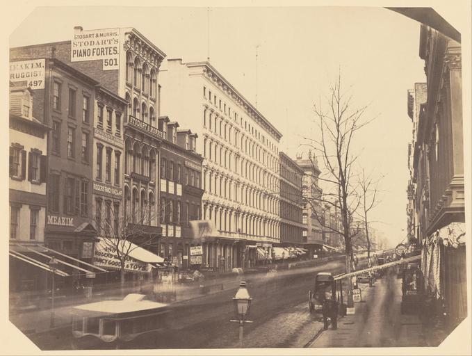 Keywords: Attributed to Silas A. Holmes (American - Broadway Looking North from Between Grand and Broome Streets - Google Art Project.jpg is not from the Getty Museum or the Google Art Project On the right of the picture is the extant E V Haughwout Building occupying the northeast corner of the intersection of Broadway and Broome Street and at left is 495 Broadway which is north of Broome Street so the camera must be at Broome Street rather than south of it Haughwout opened in 1857 LPC 11 and 42 and by late 1859 495 Broadway had been replaced by a new cast-iron building for Grover and Baker Gobright 113 SA 303 and this image with a similar view so the picture must have been taken in 1857 1858 or 1859 Also of dating interest are the signs on the side and front of 501 for Stodart Morris established in 1856 Clinkscale 360 col 1 ; the photo-related business of E Anthony had taken over 501 by May 1860 Gobright 145 The St Nicholas Hotel comprises both the white building c and the dark building just north right of it Sources plus two helpful maps are Clinkscale Martha N http //books google com/books id iqK3FPhQm5gC Makers of the Piano Vol 2 New York Oxford University Press 1999 Gobright John Christopher Pratt http //books google com/books id jBo1AQAAMAAJ The Union Sketch-book New York Pudney Russell 1860 LPC http //www nyc gov/html/lpc/downloads/pdf/reports/SoHo_HD pdf SoHo - Cast Iron Historic District Designation Report New York City Landmarks Preservation Commission August 14 1973 SA The Growth of the Sewing-machine Business Scientific American New Series Vol 1 No 19 New York November 5 1859 online at http //ebooks library cornell edu/cgi/t/text/pageviewer-idx c scia;cc scia;idno scia1001-19;node scia1001-19 3A1;view image;seq 307;size 200;page root Cornell University Library Perris William Maps of the City of New York Vol 2 Plate 30 William Perris 1852 at The New York Public Library Digital Collections http //digitalgallery nypl org/nypldigital/dgkeysearchdetail cfm trg 1 strucID 673677 imageID 1269998 parent_id 673647 snum s notword d c f k 4 sScope sLevel sLabel sort total 105 num 0 imgs 60 pNum pos 33 Image ID 1269998 Perris William Map of the City of New York 3rd ed Vol 2 Plate 22 New York Perris Browne 1857 at The New York Public Library Digital Collections http //digitalgallery nypl org/nypldigital/dgkeysearchdetail cfm trg 1 strucID 667150 imageID 1268310 total 130 num 20 parent_id 666056 s notword d c f k 1 sScope sLevel sLabel lword lfield sort imgs 20 pos 24 snum e w Image ID 1268310 1820 1886 1820 - 1886 6791139 Attributed to Silas A Holmes American American 1820 - 1886 /collection/the-j-paul-getty-museum/artwork/broadway-looking-north-from-between-grand-and-broome-streets-attributed-to-silas-a-holmes-american-1820-1886/6577761/ Attributed to Silas A Holmes American 1820 - 1886 photographer /artist/silas-a-holmes/6565886/ 6565886 /collection/the-j-paul-getty-museum/ The J Paul Getty Museum 343005 http //www getty edu/museum 3/11/2012 10 09 07 PM /collection/the-j-paul-getty-museum/artwork/broadway-looking-north-from-between-grand-and-broome-streets-attributed-to-silas-a-holmes-american-1820-1886/6577761/ 1853 about 1853 - 1855 Street Scenes St Nicholas Hotel Salted paper 292 6577761 True 1855 3/25/2012 5 16 55 AM lido getty edu-gm-obj44974 http //www getty edu/art/gettyguide/artObjectDetails artobj 44974 http //www getty edu/legal/copyright html Print 1850 1860 Not on display w391 x h292 cm about 1853 - 1855 False 1 32642487046632 Object broadway-looking-north-from-between-grand-and-broome-streets-attributed-to-silas-a-holmes-american-1820-1886 Broadway Looking North from Between Grand and Broome Streets b 391 Salted paper Street Scenes St Nicholas Hotel http //www getty edu/legal/copyright html special url_id lwH-i5Fp41JCMw PD-old-100-1923 1886 Google Art Project works by Silas A Holmes attributed Broadway in the 19th century Grand Street Manhattan Broome Street Manhattan New York City in the 1850s Photographs in the Getty Center St Nicholas Hotel 1850s photographs