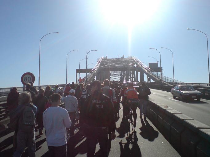 Keywords: Auckland Harbour Bridge Protest 03.jpg Protesters for a walk- and cycleway across the Auckland Harbour Bridge between Auckland City and North Shore City in New Zealand shown near the central span after having walked up on the southern-side approach viaduct on the closed northbound lanes The protesters swarmed onto the bridge after several individuals made their way around police barriers and walked / cycled onto the motorway upon which the whole northbound traffic was stopped by police and highway workers in turn animating the rest of the crowd to join them on the now-closed lanes with police deciding to abandon the attempt to turn them back self-photographed 2009-05-24 Uploader -36 83116 174 7451985 Photos taken by Ingolfson Crowds in New Zealand Protest for a walk- and cycleway across Auckland Harbour Bridge 2009 People of Auckland Speed limit signs in New Zealand |