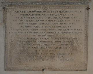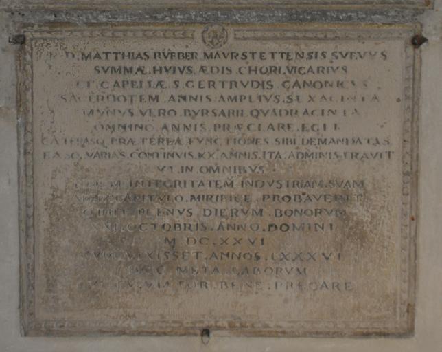 Keywords: Augsburg Domkreuzgang Nr231.jpg Augsburg Dom Kreuzgang Nordflügel 8 Joch Epitaph für Matthias Rüeber 21 Oktober 1626 aus Mauerstetten; Kosel Nr 231; Solnhofener Stein; Inschrift oben kleines Wappen own 2015-11 UliE1350 cc-0 Wall mounted church monuments in the cloister of Augsburg Cathedral 1626 works in Bavaria |