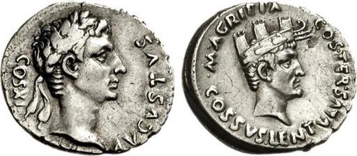 Keywords: Augustus with Agrippa.jpg en Augustus with Agrippa 27 BC-AD 14 AR Denarius 3/91 g 6h Rome mint Cossus Cornelius Lentulus moneyer Struck 12 BC AVGVSTVS COS XI head of Augustus right wearing oak wreath / M AGRIPPA COS TER COSSVS LENTVLVS head of Agrippa right wearing mural and rostral crown RIC I 414; RSC 1 Agrippa and Augustus ; BMCRE 121 BMCRR Rome 4671; BN 548-50 Near EF lightly toned a couple of shallow scratches on reverse Rare ru Дена ий се еб о онетный дво Рим дата чеканки 12 г до н э вес 3 91 г; ось 6 ч ; АВЕРС AVGVSTVS COS XI Augustus consul undecimo голова Августа в дубовом венке вп аво РЕВЕРС M AGRIPPA COS TER COSSVS LENTVLVS Marcus Agrippa consul tertio Cossus Lentulus голова Аг иппы в стенном и ост альном венках вп аво http //www acsearch info/record html id 26296 Author 12 BC PD-Art Coins of Agrippa Coins of Augustus Denarius |