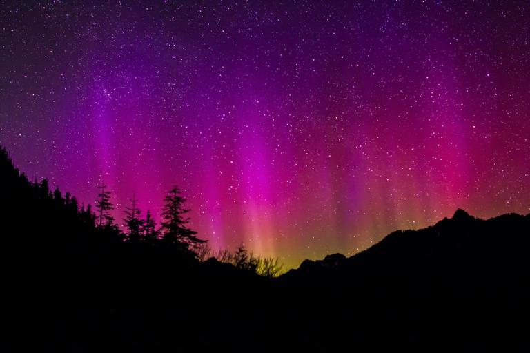Keywords: aurora borealis northern lights sky night landscape nature dark colorful bright hills silhouettes tranquil skyline trees