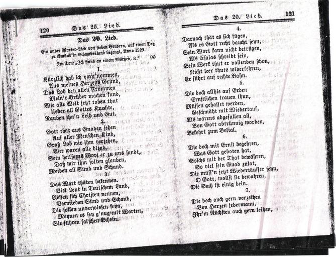Keywords: Ausbund 1977 1.jpg Ausbund das ist Etliche schöne Christliche Lieder 13 Auflage Verlag von den Amischen Gemeinden in Lancaster County Pa 1977 pp 120-124 no 20 scan from book 1529 anabaptist songwriter PD-old-100 Books about Schwäbisch Gmünd |