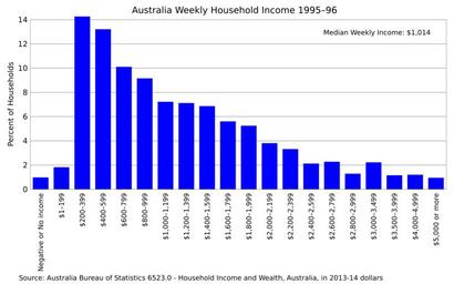 Keywords: Australia household income 1996.svg en Weekly household income distribution of Australia in 1995-1996 Data from Australian Bureau of Statistics http //www abs gov au/AUSSTATS/abs nsf/DetailsPage/6523 02013-14 Household Income and Wealth 2016-06-17 own Delphi234 other versions cc-zero Income distribution in Australia |