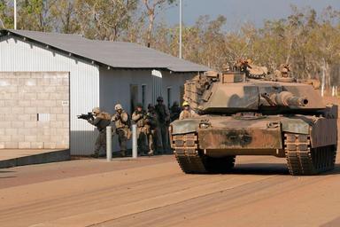 Keywords: Australia M1 tank training with US Marines Sept 2012.JPG en Marines advance alongside an Australian M1A1 tank during a bilateral assault at the urban operations training facility at Mount Bundy Training Area Northern Territory Australia Sept 5 For approximately three weeks Marines conducted bilateral field training with various elements of the Australian Army The tank is assigned to 2nd Troop A Squadron 1st Armored Regiment Australian Army The Marines are with Company F 2nd Battalion 3rd Marine Regiment 3rd Marine Division III Marine Expeditionary Force 2012-09-04 21 31 08 http //www marines mil/Photos aspx mgqs 2261045 Cpl Jacob D Barber PD-USGov Uploaded with UploadWizard M1 Abrams in Australian service 1st Armoured Regiment Australia