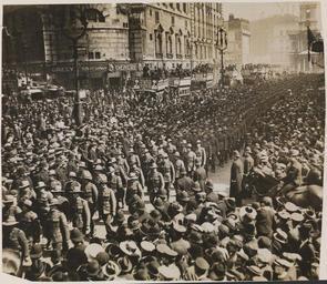 | Keywords: national library of australia nationallibraryofaustralia xmlns:dc=http://purl.org/dc/elements/1.1/ xmlns:dc=httppurlorgdcelements11 dc:identifier=http://nla.gov.au/nla.pic-vn6572573 dc:identifier=httpnlagovaunlapicvn6572573 anzac day anzacday 1916 london world war i worldwari wwi anzac people monochrome crowd outdoor Title devised by cataloguer based on compactus card and reference sources.; Part of the collection: World War I (1914-1918) soldiers, England.; Condition: Yellowing, creases, tears.; "The first Anzac Day was conducted in 1916. The troops observed it in various ways, and in London large crowds watched 2,000 Australians and New Zealanders march to Westminster Abbey."--Australian War Memorial : Dawn of the Legend (www.awm.gov.au/exhibitions/dawn/spirit/ - viewed 9/9/14); Also available online at: nla.gov.au/nla.pic-vn6572573. Persistent URL nla.gov.au/nla.pic-vn6572573 Title devised by cataloguer based on compactus card and reference sources.; Part of the collection: World War I (1914-1918) soldiers, England.; Condition: Yellowing, creases, tears.; "The first Anzac Day was conducted in 1916. The troops observed it in various ways, and in London large crowds watched 2,000 Australians and New Zealanders march to Westminster Abbey."--Australian War Memorial : Dawn of the Legend (www.awm.gov.au/exhibitions/dawn/spirit/ - viewed 9/9/14); Also available online at: nla.gov.au/nla.pic-vn6572573. Persistent URL nla.gov.au/nla.pic-vn6572573 |