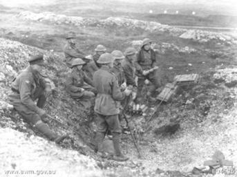 | Keywords: AustralianStokesMortarInstructionAveluy22January1918.jpg A group of unidentified Australians receiving instruction in the working of a Stokes trench mortar in cooperation with other arms at the Australian Corps Training School The colour patches of two soldiers one sitting in the foreground left and the other sitting near the centre indicate they are probably members of the 26th Battalion and the colour patch of another soldier background left indicates he is a member of AIF Administrative Headquarters <br>Place made France Picardie Somme Aveluy <br>NOTE This version of the photograph has brightness and contrast artificially increased to highlight details E04596 1918-01-22 Photographer Copyright clear PD-AustraliaGov watermark 3 inch Stokes Mortar World War I forces of Australia in France Aveluy World War I military training Black and white photographs Aveluy |