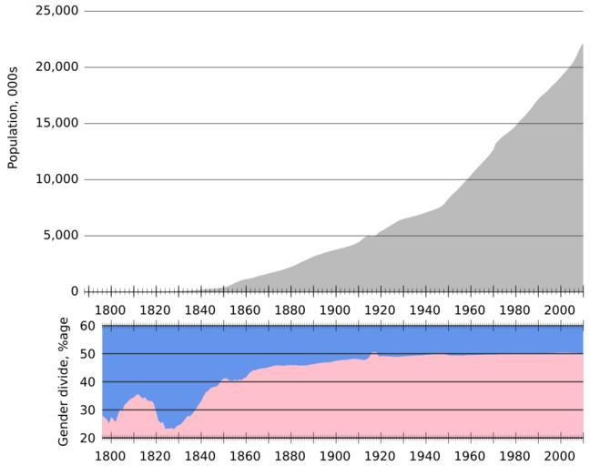 | Keywords: Australia's population and gender composition since 1788.svg Australia's population since 1788 and gender composition since 1796 Latest figures through 2010 Data source Australian Bureau of Statistics http //www abs gov au/AUSSTATS/abs nsf/DetailsPage/3105 0 65 0012014 OpenDocument Population Size and Growth Own 2007-06-16 El T Original data Year Males Females Total 1788 na na 859 1789 na na 645 1790 na na 2056 1791 na na 2873 1792 na na 3264 1793 na na 3514 1794 na na 3579 1795 na na 3466 1796 2953 1147 4100 1797 3160 1184 4344 1798 3367 1221 4588 1799 3804 1284 5088 1800 3780 1437 5217 1801 4372 1573 5945 1802 5208 1806 7014 1803 5185 2053 7238 1804 5313 2285 7598 1805 5395 2312 7707 1806 5389 2521 7910 1807 5939 2855 8794 1808 6822 3441 10263 1809 7618 3942 11560 1810 7585 3981 11566 1811 7697 44468 11875 1812 8132 4498 12630 1813 9102 4855 13957 1814 9295 4791 14086 1815 9848 5215 15063 1816 11690 5863 17553 1817 14178 7014 21192 1818 17286 8573 25859 1819 21366 10106 31472 1820 23784 9759 33543 1821 26179 9313 35492 1822 27915 9449 37364 1823 30206 10426 40632 1824 36871 11201 48072 1825 40288 12217 52505 1826 41289 12593 53882 1827 43053 13247 56300 1828 44778 13419 58197 1829 46946 14988 61934 1830 52885 17154 70039 1831 57037 18944 75981 1832 62254 21683 83937 1833 71669 26426 98095 1834 76259 29297 105556 1835 81929 31425 113354 1836 89417 35703 125120 1837 94881 39607 134488 1838 105271 46597 151868 1839 115480 54459 169939 1840 127306 63102 190408 1841 144114 76854 220968 1842 153758 87226 240984 1843 158846 92002 250848 1844 165034 99253 264287 1845 173159 105989 279148 1846 181342 111907 293249 1847 190265 118532 308797 1848 201612 130716 332328 1849 221978 151384 373362 1850 238683 166673 405356 1851 256975 180690 437665 1852 304126 209670 513796 1853 358203 242789 600992 1854 414337 280580 694917 1855 470118 323142 793260 1856 522144 354585 876729 1857 574800 395487 970287 1858 624380 426448 1050828 1859 644376 452929 1097305 1860 668560 477025 1145585 1861 669373 498776 1168149 1862 683650 523268 1206918 1863 704259 555033 1259292 1864 740433 584750 1325183 1865 773278 616765 1390043 1866 800648 643307 1443955 1867 819127 664721 1483848 1868 849272 690280 1539552 1869 875139 717018 1592157 1870 902494 745262 1647756 1871 928918 771970 1700888 1872 947422 795425 1742847 1873 972907 821613 1794520 1874 1001096 848296 1849392 1875 1028489 869734 1898223 1876 1061477 897202 1958679 1877 1102340 928790 2031130 1878 1132573 959591 2092164 1879 1168781 993562 2162343 1880 1204514 1027017 2231531 1881 1247059 1059677 2306736 1882 1289892 1098190 2388082 1883 1357423 1148313 2505736 1884 1411996 1193729 2605725 1885 1460394 1234124 2694518 1886 1510954 1277096 2788050 1887 1559118 1322244 2881362 1888 1610548 1371129 2981677 1889 1649094 1413383 3062477 1890 1692831 1458524 3151355 1891 1736617 1504368 3240985 1892 1766772 1538981 3305753 1893 1791815 1570080 3361895 1894 1824217 1602543 3426760 1895 1855539 1636082 3491621 1896 1887174 1665924 3553098 1897 1917460 1700323 3617783 1898 1937629 1727086 3664715 1899 1959074 1756914 3715988 1900 1976992 1788347 3765339 1901 2004836 1820077 3824913 1902 2028008 1847310 3875318 1903 2045144 1871448 3916592 1904 2072783 1901367 3974150 1905 2100118 1932859 4032977 1906 2126730 1964755 4091485 1907 2160213 2001509 4161722 1908 2193981 2038297 4232278 1909 2242215 2081745 4323960 1910 2296308 2128775 4425083 1911 2382232 2191554 4573786 1912 2478230 2268359 4746589 1913 2554931 2338810 4893741 1914 2577576 2394202 4971778 1915 2528076 2441381 4969457 1916 2437345 2480604 4917949 1917 2458935 2523128 4982063 1918 2516527 2564385 5080912 1919 2698378 2605196 5303574 1920 2751730 2659567 5411297 1921 2799415 2711529 5510944 1922 2867825 2769461 5637286 1923 2932310 2823676 5755986 1924 2999567 2882435 5882002 1925 3063761 2939266 6003027 1926 3126802 2997218 6124020 1927 3194858 3056158 6251016 1928 3247417 3108353 6355770 1929 3284095 3152118 6436213 1930 3311722 3189029 6500751 1931 3332577 3220029 6552606 1932 3355465 3248320 6603785 1933 3379049 3277646 6656695 1934 3401865 3305382 6707247 1935 3423038 3332624 6755662 1936 3448026 3362387 6810413 1937 3476286 3395206 6871492 1938 3507543 3428366 6935909 1939 3538660 3466252 7004912 1940 3570508 3507078 7077586 1941 3598644 3544954 7143598 1942 3619699 3581397 7201096 1943 3648159 3621499 7269658 1944 3682795 3664229 7347024 1945 3721866 3708331 7430197 1946 3766689 3751292 7517981 1947 3828462 3809501 7637963 1948 3908586 3883879 7792465 1949 4047252 3998318 8045570 1950 4191445 4116036 8307481 1951 4310933 4216974 8527907 1952 4425528 4314041 8739569 1953 4503278 4399408 8902686 1954 4597667 4492269 9089936 1955 4713817 4598008 9311825 1956 4828846 4702025 9530871 1957 4930160 4813927 9744087 1958 5026095 4921263 9947358 1959 5132363 5028605 10160968 1960 5253073 5138847 10391920 1961 a 5374304 5268350 10642654 1962 5470040 5376019 10846059 1963 5571613 5483869 11055482 1964 5682962 5597467 11280429 1965 5793629 5711779 11505408 1966 5890642 5814201 11704843 1967 5992280 5919973 11912253 1968 6108185 6037397 12145582 1969 6238338 6168879 12407217 1970 6364877 6298592 12663469 1971 b 6632838 6565542 13198380 1972 6735679 6673609 13409288 1973 6835488 6778856 13614344 1974 6941940 6890038 13831978 1975 7002232 6966649 13968881 1976 7065779 7044328 14110107 1977 7145407 7136126 14281533 1978 7213574 7217256 14430830 1979 7293341 7309140 14602481 1980 7391427 7415943 14807370 1981 7514339 7539778 15054117 1982 7633179 7655712 15288891 1983 7730415 7753081 15483496 1984 7826368 7850914 15677282 1985 7940033 7960533 15900566 1986 8057320 8081449 16138769 1987 8181746 8212895 16394641 1988 8325068 8362014 16687082 1989 8446656 8490067 16936723 1990 8560533 8609235 17169768 1991 8659623 8719358 17378981 1992 8744793 8812340 17557133 1993 8821492 8897598 17719090 1994 8906001 8987432 17893433 1995 9014765 9104851 18119616 1996 9112568 9217511 18330079 1997 9195994 9314010 18510004 19