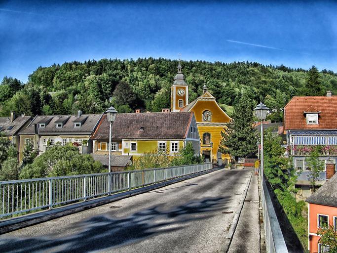 Keywords: austria village bridge buildings church hdr forest trees sky clouds summer spring outside architecture