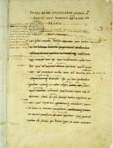 | Keywords: Autograph von Pietro Bembo.png en Letters Written for Leo X de Briefentwurf für Leo X in Cancellaresca http //www ibiblio org/expo/vatican exhibit/exhibit/c-humanism/Ciceronianism Vat lat 3364 fol 1 recto Creator Pietro Bembo circa 1517 1519 PD PD-old-100 Humanistische Kursive Pietro Bembo Vatican Library manuscripts Italian manuscripts |