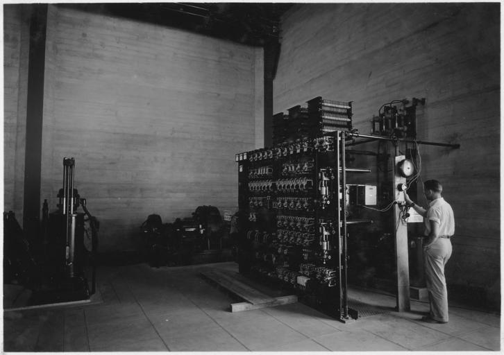 | Keywords: Automatic switchboard, 150-ton cableway hoist house - NARA - 293942.jpg Scope and content Photograph from Volume Two of a series of photo albums documenting the construction of Hoover Dam Boulder City Nevada General notes 293942 Local identifier Department of the Interior Bureau of Reclamation Engineering and Research Center 05/18/1981 - 03/04/1988 NARA's Rocky Mountain Region Denver NRGA Building 48 Denver Federal Center West 6th Avenue and Kipling Street Denver CO 80225-0307 1933-08-29 Record group Record Group 115 Records of the Bureau of Reclamation 1889 - 2008 Record group ARC 444 Photograph albums compiled 1903 - 1972 Series ARC 293611 File unit File unit ARC Variant control numbers NAIL Control Number NRG-115-CONSTPHO85006-BC21934 Other versions <gallery> File Automatic switchboard 150-ton cableway hoist house - NARA - 293942 tif tif </gallery> NARA-cooperation PD-USGov Cableway stations 1933 Six Companies Inc cableways at Hoover Dam construction site Hoist house interior 1933 in the United States Hoover Dam |