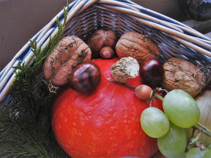 Keywords: autumn basket autumn fruits autumn herbstdeko thanksgiving decoration autumn decoration decorative food bless you time of year pumpkin orange autumn motive hokkaidokürbis walnuts chestnut nuts grapes healthy botany