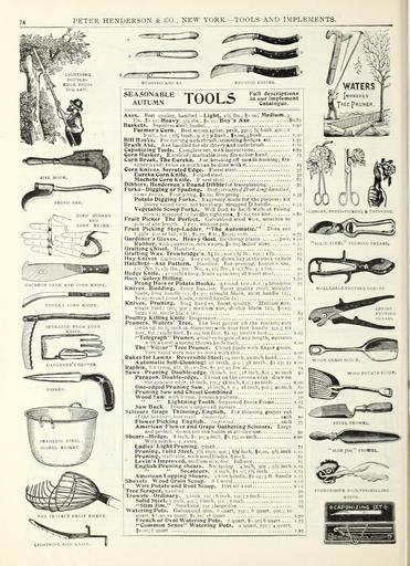| Keywords: Autumn bulbs catalogue (16264563560).jpg s <br> in our implement <br> Catalogue <br> 85 <br> Axes Best quality handled ” Light a 4 lbs 1 00; Medium 3 <br> lbs 1 15; Heavy i A lbs 1 25; Boy's Axe 0 85 <br> Baskets Seamle -s iteel; bushel 2-50 <br> Farmer's Corn Best woven splint peck 35c ; H bush 450 ; i <br> bisi fcc; i bush 9 c; 2 bush 1 00 3bush 1 50 <br> Bill Hooks For cut ini underbrush trimming hedget etc 1 35 <br> Brush Axe Axe handled for shrjbbery and underbrush i ic <br> Caponizing Tools Complete set with instructions 2 75 <br> Corn llusker Excelsiof; malleable iron; fits either hand 15 <br> Corn Break The Eureka Kor breaking off ears in busking; fits <br> either hnd; twice as iruch can be done with it 25 <br> Corn Knives Serrated Edge Finest steel js <br> Eureka Corn Knife Forged steel 35 <br> Machete Corn Knife Fneststtel 65 <br> Dibbers Henderson's Round Dibble for transplanting 35 <br> Forks ” Digging or Spading Btit- straf'/'id D or long handled <br> sa-me prices Four prong f 1 10; five prong 1 35 <br> Potato Digging Forks F ipressly made for the purpose; six <br> heavy round tire not too sharp strapped D handle 1 35 <br> Vegetable Scoop Forks Will load to hesd without raising <br> poin'S; strapped 1 handle; eight tint 1 60; ten tine 1 80 <br> Fruit Picker The Perfect Galvanized steel wire attaches to <br> ptle of any lenath r c» without pole 50 <br> Fruit Picking Step-Ladder The Automatic Does not <br> t pple slip or fall; 6 ft Si 75; 8 It 2 25; loft 2 75 <br> Gardener's Gloves Heavy Qoat for thorny plants pa'r i co <br> Rubber wiih i auntlets men's sizes 1 60; ladies' sizes 1 5 j <br> Grafting Chisel Handled 75 <br> Grafting Wax Trowbridge's lb icc; j lb 15c ; 1 lb 25 <br> Hay Knives Lightning For cutt ng down hayin the stack cr bale 85 <br> Hatchets ” Axe Pattern Handled For pruning hunter's use <br> etc No I 152 lbs 70c ; No 2 iji Ib 8 c No 3 2 lbs 90 <br> Hedge Knife 2 r inches long bade 13 inches; of finest steel 5- <br> Hoes ” Celery Hilling 1 50 <br> Prong Hoes or Potato Hooks 5 round tine 8 ;c 14 broadiine 75 <br> Knives Budding Ivoiy han les finest quality steel; straight <br> blade long handle ¢_ §i 5o; straight blade shcrt handle b <br> 1 25; round point blade curved handle a 1 25 <br> Knives Pruning Stag hand es finest q'lality Medium size <br> single tladj d 90c ; med um size dcubie blade e 1 25; <br> large s'ze sin-le bla_e fi _ <br> Poultry KillingKnife Progressive <br> Pruners Waters' Tree The best pruner on the maiket; cuts <br> limbs up to 3 inch in diamtter; with four foot handle 75c ; six <br> foot 85C ; eight foot 1 00; ten foot 1 15; twelve foot x 25 <br> Telegraph Pruner attaches to pole of any length operates <br> with a cord a spring throws knife back i io <br> The Victor Tree Pruner Chisel blade with finger guide <br> Very rapid work may b done wiih this 2 00 <br> Rakes for Lawns- Reversible Steel; 24 tecih ai inch head to <br> Automatic Self-Cleaning; 26 teeth oc ; 38 teeth §1 15; 52 200 <br> Raphia f' r tying I' c lb ; m lbs 1 5 ; 25 lbs at 14 <br> Saws ” Pruning Double-edge 16 inch 7cc ; i3 inch 8 c ; 20 inch gj <br> Paragon Double-edge Thrust on the convex edge draw on <br> the concave ed ;e 16 inch 75c ; 18 inch B;C ; 20 inch 1 00 <br> One-edged Pruning Saw i6inch 6 c; i8'inch 7cc ; aoinch fo <br> Pruning Saw and Chisel Combined 1 00 <br> Wood Saw with fr ime commcn pattern ;o <br> Lightning Tooth Improved Brace Frame 1 15 <br> Saw Buck I isston's improved pattern 60 <br> Scissors Grape Thinning English For thinning grapes out <br> cf the but chp«; best steel hnpctrti-d e»ch 70 <br> Flower Picking English hiip i -trd each 75 <br> American Flower and Grape Gathering Scissors Large <br> and perfect donottirethe hands in all-da v use 90 <br> Shears ” Hedge 8 inch 1 50; 9 inch 1 75; 10 inch a 00 <br> With notch 2 c extra <br> Ladies' Light Pruning 7inch 75 <br> Pruning iolid Steel / inch 90c ; 8 inch 1 00 95 inch i io <br> Pruning malleable with steel blades 8 inch 60 <br> Levin's Improved medium si/e 60c full size 75 <br> English Pruning shears No spring 4 inch 90c; 5H inch i io <br> Secateurs 6 inch 1 s-; 7K inch 1 75 <br> American Lopping Shears 2 loot handle 1 25; 3 ft handle 1 75 <br> Shovels Wood Grain Scoop A I wood i o <br> Wire Potato and Root Scoop Uirlsifsout 2 c o <br> Tree Scraper liandkd 50 <br> Trowels Ordinary s inch 12c 6 inch i c; 7 inch »o <br> Solid Steel – ; inch 4 c ; 6 inch cc ; 7 inch 55 <br> Slim Jim Small size nic ; large size 25 <br> Watering Pots Galvanized iron 6 uart 75c ; 8 quart 90c ; to <br> quart i oo 12 qu irl i 2 ; ifi quart 1 50 <br> French or Oval Watering Pots f quart 1 50; 8 quart 1 75 <br> Common Sense Watering Pots 2 quart 75c ; 4 quart <br> i o ; ' – uart l »5 <br> Wt 0O GRAIN SCO P <br> – WIRE POTATO SCOOr <br> rKOCSFSSIVE lolT TRV-Ktl l lsr <br> LICHTNINC HAV KMKE 43899786 149965 78524 Page 74 Text http //www biodiversitylibrary org/page/43899786 1900 10 5962/bhl title 78524 Henry G Gilbert Nursery and Seed Trade Catalog Collection ; Peter Henderson Co NameFound Medium NameConfirmed Medium NameBankID 4904049 NameFound Raphia NameConfirmed Raphia EOLID 29413 NameBankID 4935115 Biodiversity Heritage Library Autumn bulbs catalogue 1900 Garden Stories Bulbs Plants Catalogs Equipment and supplies Flowers Gardening Seeds Trade catalogues U S Department of Agriculture National Agricultural Library bhl page 43899786 dc identifier http //biodiversitylibrary org/page/43899786 Peter Henderson Co bhlGardenStories BHLinbloom bulbs plants u s department of agriculture national agricultural library peter henderson co bhlgardenstories bhlinbloom Information field Flickr posted date ISOdate 2015-02-05 Check categories 2015 August 24 CC-BY-2 0 BioDivLibrary https //flickr com/photos/61021753 N02/16264563560 2015-08-24 23 59 23 cc-by-2 0 PD-old-70-1923 Autumn bulbs catalogue Photos uploaded from Flickr by Fæ using a script |