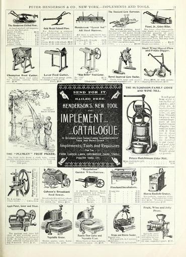Keywords: Autumn bulbs catalogue (16425992346).jpg PETER HENDERSON CO NEW YORK ” IMPLEMENTS AND TOOLS <br> '/5 <br> The Hendersao Chilkd Plow <br> Ah hanl asKteoI; all iinprovL - <br> nK- iU4; the iH;»l plow <br> Ughl 1 linrsc gi riO <br> Mt-'diufii 1 lionfe 6 CU <br> Full 1 buisc' g riU <br> J i lit 2 lionie 7 50 <br> lc' lium 2hoine –  –  8 00 <br> Full 2 horse 8 50 <br> Whwl fxlia 1 00 <br> J«iinter fxira 2 U0 <br> Gold Medal Subsoil Plow <br> For foMou Irit a coininuii <br> w l nakli t op tin- –  iilh to <br> liiKplh if IJillchi-i ilh 1 hono <br> plow aDd20irH'h 'Uwitli2- ioi-su <br> without tlirowing subsoil on <br> l p <br> 1 liorst 85 00 with wheel J« 00 <br> 2 lior-k- t; 0O wlch whtfl 18 U <br> Henderson Lever Set <br> All Steel Harrow <br> All sticl n spiki-toolh bur- <br> row u Hiuoothiiii; luirrow ull <br> ill one <br> 1 Hettloil 4 ft 25 tifth fe 75 <br> a ¢ ¢ 8 ¢ ¢ 50 ¢ ¢ 1 ; o« <br> a 12 75 ¢ ¢ 18 U <br> The eofliesfe workincr most <br> durablf Hrifntirtc antriK-st on <br> the inarki't All mctJil finest <br> quality knives the automatic <br> puunls ab ' olutely proteet from <br> dani er will cut one or two <br> rows nt once Can be ojKTatwl <br> by I ither one or two men <br> I rice <br> Planet Jr Celery Hllkr <br> Has It-'vtT wheel for r»» rula- <br> tlnjf depth; lever expander to <br> rr-K ilato quantity of earth <br> thrown Tno ¢ – Sinple Hiller <br> thrtnvH higlier and works In <br> imrrower rows but only does <br> one side of a row <br> Double row hiller U 00 <br> 16 00 Single row liiller <br> 11 00 <br> Champion Root Cutter <br> Thi- best ebe iii root cutter <br> for turnips carrots be -ts <br> etc 7 00 <br> L«ver Feed Cutter <br> Furnished witbtrauKc i late <br> c S3 50 <br> 'Hide Roller Feed Cutter <br> No OO i; ;5 Burrel Improved Cora Shelter <br> Ym j thcMs both inrk'c and sritill <br> No O <br> Other size u <br> and scjiarates cob «f j <br> Steel Wing Shovel Plow <br> and Potato Digger <br> Price gd iW; or with jiotato- <br> di rjrintr attachment y tf»j <br> THE <br> PLUjrLET <br> FRUIT PICKER <br> THE PLUMLEY FRUIT PICKER <br> Tlie fruit rollii down a cloth ttibe conse- <br> quently the picker floes n- tt have to be lowered <br> Price without jmlc 1 00 <br> with pole 1 25 <br> ' v ' vy vy v 'iv 'iv 'iv 'iv ' v7 v iv ' v 'ivy v <br> SEND FOR IT <br> MAILED JFREfi <br> HENDERSON'S NEW TOOL <br> IMPdMEtfT <br> olfFflLGGUE <br> It Describes And Shovvs Large liLusTRArioNS'OP <br> –  These and Many Other –  ' –  –  <br> Implements -Tools and Requisites <br> ' ¢ FdrThc -y- <br> FARM GARDEN LAWN GREENHOUSE; DAIfW STABLE <br> j ' POULTRY YARD ETC A <br> THE HtTCHINSON FAMILY CIDER <br> AND WINE niLL <br> It will grind <br> from e/j /'t to <br> tt-n dushirh o/ <br> apples and <br> /rom Un io <br> tivtl-'C bushels <br> o/grapt-s i ur <br> rents t'tc per <br> tiour Thecurb <br> or pic s will <br> coniaia I he po- <br> mace of one <br> bushcif r more <br> of apples One <br> maa can make <br> with it from <br> tluo to three <br> bnrrels o/ ci <br> der or from <br> one hundred <br> to one hund- <br> red and /t/ty <br> ga 1 1 o n s oj <br> wine pi- r day <br> Weight about <br> jco pounds <br> Prices Hutchinson Cider Mill <br> With ll xU inch curl 10 00 <br> ¢ 12-\1'- –  –  11 00 <br> Regulation <br> Garden Wheelbarrow <br> Cahoon's Broadcast <br> Seed Sower <br> Broadcasts 16 to 10 feet wheat <br> rye oais barley tlinothv clo- <br> ver millet etc Price 3 75 <br> A superior Barrow hand- <br> somely iiainted and stri ed ; <br> iron leg oiaces liolted on <br> Number Size Price <br> No 2 Toy's 2 7 - <br> No \ MeOiuin 3 ' 0 <br> No 5 Large 1 00 <br> Plneland Incubators <br> 30-egKsizc <br> 60 ' <br> 100 <br> £00 <br> 300 <br> 3t» <br> 100 <br> 9 50 <br> 16 00 <br> 20 1 0 <br> 3- ' llO <br> 10 110 <br> 15 00 <br> 60 00 <br> Horse Radish Qrater <br> Box patt Tli cnpjicit v 15 lbs <br> all hour I'ei'i'onited tin cylin- <br> der 6 50 Wooden cylinder <br> studded sti-el pins 7 50 <br> Apple Parer Corer and SHcer <br> The porinprs and Juice fall <br> clear of the workinpf parts; <br> sirnnK durable and i;o »s gooii <br> work It can be used to pare <br> only without coriiiif and sllc- <br> ingr if desired Price 3 <br> Vegetable Grater <br> Orates apples corn horso <br> radish cheese etc i3 00 <br> Family Slaw Cut'tr and <br> Vegetable Sl cer <br> Slices thick or thin potatocfi <br> cucumbers onion etc 3 00 <br> Fruit Wine and Jelly <br> Press <br> Grape and RaUio Seeder <br> Family siie 1 00 <br> Will 8ce l 1 lb in 6 minutes <br> Hotel alzv SJO <br> Will secKl 1 lb In 1 minute <br> Ejctmcta Juice <br> and cjei'Ls s -c Is <br> and skins in one <br> operation Fiun- <br> lly Bixe capacity 1 quart 3 00 43899787 149965 78524 Page 75 Text http //www biodiversitylibrary org/page/43899787 1900 10 5962/bhl title 78524 Henry G Gilbert Nursery and Seed Trade Catalog Collection ; Peter Henderson Co Biodiversity Heritage Library Autumn bulbs catalogue 1900 Garden Stories Bulbs Plants Catalogs Equipment and supplies Flowers Gardening Seeds Trade catalogues U S Department of Agriculture National Agricultural Library bhl page 43899787 dc identifier http //biodiversitylibrary org/page/43899787 Peter Henderson Co bhlGardenStories BHLinbloom bulbs plants u s department of agriculture national agricultural library peter henderson co bhlgardenstories bhlinbloom Information field Flickr posted date ISOdate 2015-02-05 Check categories 2015 August 24 CC-BY-2 0 BioDivLibrary https //flickr com/photos/61021753 N02/16425992346 2015-08-24 23 59 25 cc-by-2 0 PD-old-70-1923 Autumn bulbs catalogue Photos uploaded from Flickr by Fæ using a script