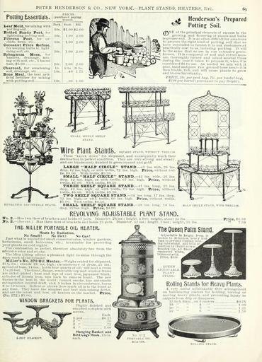 Keywords: Autumn bulbs catalogue (16451031972).jpg PETER HENDERSON CO NEW YORIC -PLANT STANDS HEATERS Etc <br> 69 <br> Potting E s8ential8 <br> Iieaf Mold for mixing with <br> llOttlllKHDll <br> Botted Sandy Feat or <br> llliliti'iiliij; ioitiiiK woil <br> Fibrous Peat fur or- <br> lii N ferns i-tr <br> Cocoanut Fibre Kefuse <br> for kiM'piri ImlliH In liKht- <br> iiln ; Holl etc <br> Spbagnum Moss lor <br> baskftH drainage ml x- <br> Ing with soil etc 5 barrel <br> bale 5 00 <br> Charcoal for Bweetenlug <br> Hcill lrulnii;;e etc <br> Bone Meal the beHt arti- <br> ficial fertilizer for mixing <br> with pottiugeoll <br> PRICES <br> purchajier <br> tranΒ»ft <br> Peck <br> SOc <br> 30c <br> 30c <br> 30c <br> SOc <br> Lb <br> 10c <br> 10c <br> BuBh Bbl <br> 1 00 2 00 <br> 1 00 2 00 <br> 1 00 2 00 <br> Henderson's Prepared <br> Potting Soil <br> /TNXE of the principal eleineiitB of suceeoe In the <br> Vv' growing and flowering of piantH and bulbs <br> Ik proper Koil It in ho often dithcnlt for amateurs <br> to procure the right kind of potting soil that we <br> have concluded to urnlHh it to our cuHtomerH at <br> Iiracticail v coHt to uh Including packing It will <br> hetiieBame that ne UHe In our ex teuHlve green- <br> houKex It 1h conipoKcd of sod and rotted man- <br> ure thoroughly turned and mixed Heveral times <br> during the year it takes to jircpnre It when it Is <br> conHidered It to use As needed we mix with It <br> peat sand and pure raw ground bone meal it Is <br> tiien friable rich and will cause plants to grow <br> and bloom luxuridntiy <br> PRICE 2 jc per peck hag 7oe per bushel hag <br> 9J 00 per barret purchaser to pay freight <br> S MALL 6INGLE SBBLP <br> STAND <br> Wire Plant Stands <br> SQIAHE SiTAXn WITHOIT TRKLl I S <br> KEVOLVING AnjfSTAULE STAND <br> No 2 HiiH two tierM of iirackots and holds 1 7 p its Dianu-tci- ; <br> No 3 I ' int I Ilns three tiers of brnekets and holds 23 pots <br> Ttl5 MILLER PORTABLE OIL tIEflTER <br> Heats by Radiation <br> No Smell NoUirtI No Gas I <br> Tu t what in wanted for small coniservatories wludow gardens <br> bathrooms small be lrooras etc ; Invaluable or protecting <br> your plants on cold nights <br> The combustion is perfect therefore absolutelv free from the <br> Offensive odor and si-jOke <br> The Mica Lining allows a pleasant light to shine through the <br> Open work of the cylinrler <br> Miller's No 372 Oil Heater Weighs crated or shipment <br> 81Viilbn; stands lis 1ns iiijiii circumference of drum 2 'j Ins ; <br> ejiread of base 14 1ms iiohls four quarts o oil will iieat a room <br> l ix20 feet The fount tlnnge removable top and window frame <br> nrenlckel plated ; base and legs of cast Iron Japanned black; <br> cylinder of Russia Iron tips back to remove fount The new- <br> burner Is the best In the world; cannot smoke has automatic <br> extinguisher central draft wick 9 inches in circumference burns <br> 8 to 10 hours Indicator shows how much oil Is in the fount at <br> anytime They have tin- simplest and b -st wlck-ralsIng lievice <br> nud are the latest and bes oil heatei-s in the market Price <br> iNo 372 - 00 <br> WINDOW BRACKETS FOR PLANTS <br> Higldy linishi-d and <br> supplied complete with <br> screws <br> Each <br> 1 pot 0 2 - <br> These knock down for shipment and consequently reach their <br> destination in i erfect condition They are very strong and steady <br> and are handsomely finished in green enamel and gold <br> I ABOI HALF CIRCLE STAND 4 ins wide 28 ins <br> deeji 4l' ins lii h or with trellis 72 ins high Price without trel- <br> lis S OO With trellis ' i -o <br> SMAI I HALF CIRCLE STAND 42 ins wide 20 ins <br> deep 42 Ins high or with trellis 07 ins high Price without <br> trellis 7 110 With trellis s - o <br> THREE SHELF SQUARE STAND 41 ins bmg 2 ; Ins <br> ileep 42 ins liiirli or uilh trellis ins high Price without <br> trellis S s oo With trellis ' i - i <br> TWO SHELF SQUARE STAND 34 ins long 17 Ins deep <br> i2 ins higli or willi tn-llis r o ins lii li Price without trellis <br> 00 With tiellis sr - 0 <br> SMALL SHELF SQUARE STAND 2 S Ins long 10 Ins <br> deep 22 ins hiyli Price si 00 <br> REVOLVING ftDJUSTABLE PLANT STAND <br> lALF aRCLE STAND W <br> Ij ins ; height 4 feet; weight aliont 2 ll s <br> Diameter 32 Ins ; height 5 feet; weight 35 lbs <br> Price 11 00 <br> 7 50 <br> 4-POT DSACKET <br> HanKine Basket and <br> Birdcage Hook l 'ets <br> each <br> The Queen Palm Stand <br> Adjustable In height from lu <br> Inches to 3n Incliefl hea y iron <br> base to prevent tlpplDB; 6llt <br> Ing tube etand and iield p <br> Iiosltlonliy thumb fe <br> wooden lop all One <br> enameled white <br> trimmed gold <br> Trice ii 'M <br> QUEEN <br> ADJUSTABLE <br> I'LANT <br> STA ND <br> RolliRQ Stands tor Heavu Plants <br> A very useftd unbreakulile libre arrangement <br> on ball-bearing casters for holding turning or <br> moving heavy plants and preventing injury to <br> carpets from drip or lampness <br> 1; Inch diam on ;5 casters 0 7 5 <br> 18 ’ ’ ’ ’ 4 ’ ’ 1 00 <br> 20 ’ 5 ’ ’ 1 25 <br> 22 ’ ’ e 1 50 43899781 149965 78524 Page 69 Text http //www biodiversitylibrary org/page/43899781 1900 10 5962/bhl title 78524 Henry G Gilbert Nursery and Seed Trade Catalog Collection ; Peter Henderson Co Biodiversity Heritage Library Autumn bulbs catalogue 1900 Garden Stories Bulbs Plants Catalogs Equipment and supplies Flowers Gardening Seeds Trade catalogues U S Department of Agriculture National Agricultural Library bhl page 43899781 dc identifier http //biodiversitylibrary org/page/43899781 Peter Henderson Co bhlGardenStories Plant Stands BHLinbloom bulbs plants u s department of agriculture national agricultural library peter henderson co bhlgardenstories plant stands bhlinbloom Information field Flickr posted date ISOdate 2015-02-05 Check categories 2015 August 24 CC-BY-2 0 BioDivLibrary https //flickr com/photos/61021753 N02/16451031972 2015-08-24 23 59 36 cc-by-2 0 PD-old-70-1923 plant stands Autum