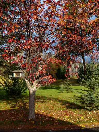 Keywords: autumn fall red leaves tree garden bird house nature season foliage color
